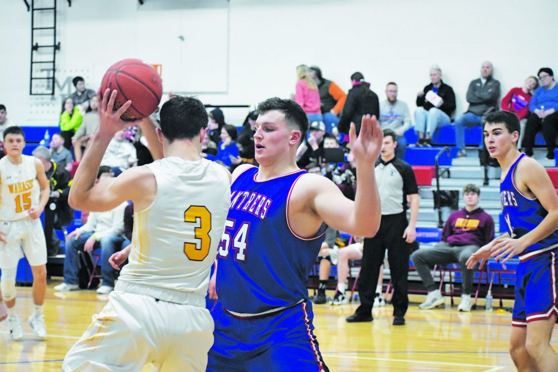 Photo by Chris Drummond TMB’s Tony Nelson (54) guards Wabasso’s Sam Fenger (3) during their game on Friday. TMB defeated Wabasso 66-54.
