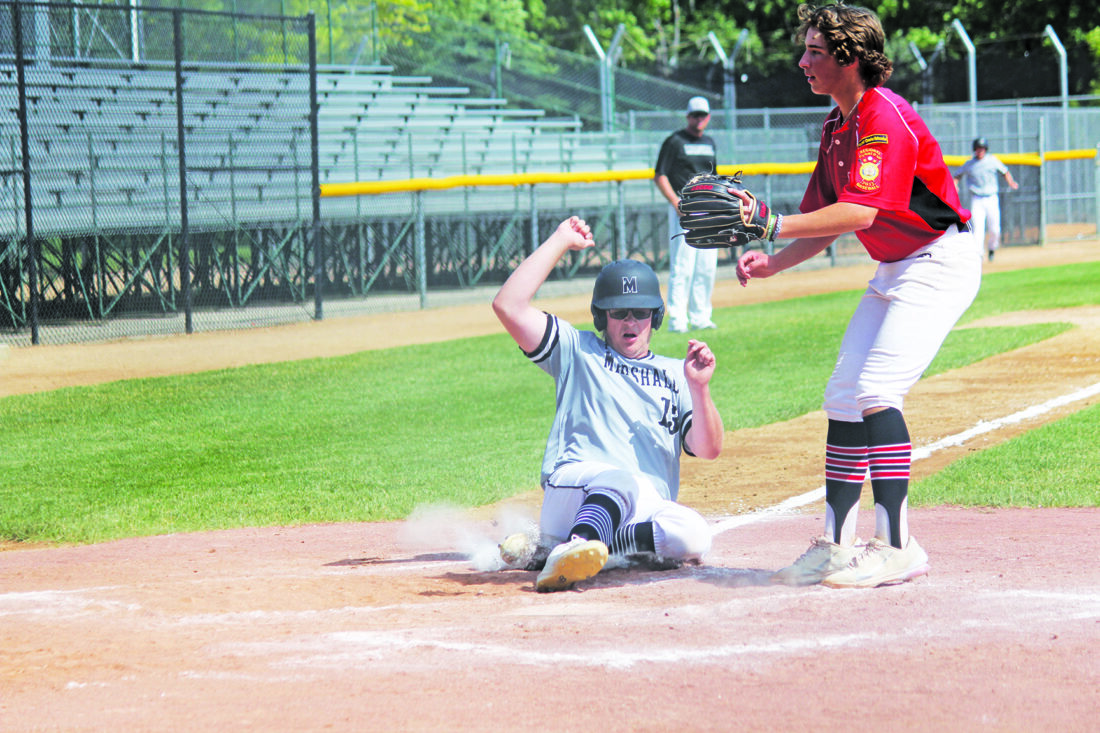 Photo by Sam Thiel Marshall 17U Black’s Andrew Cowden scores a run during their game against Omaha Westside on Saturday. Marshall 17U Black defeated Omaha Westside 4-2 and Gretna 8-5 on Saturday before falling to Brandon Valley (S.D.) 15-12 on Sunday.