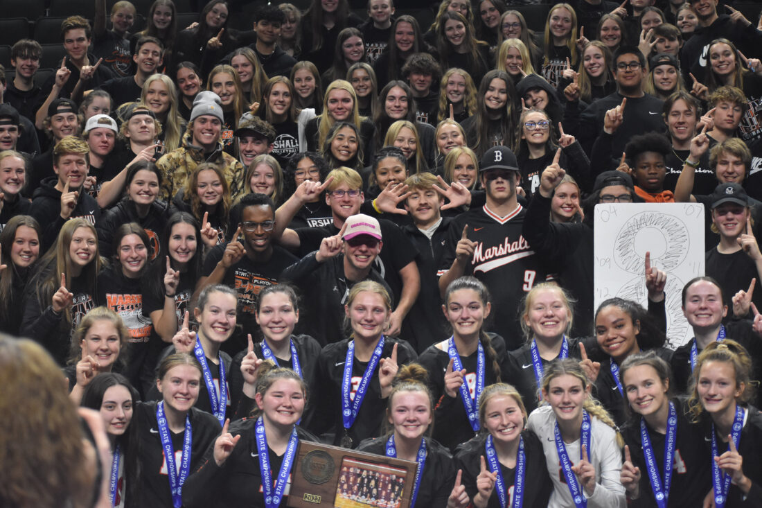 Photo by Chris Drummond: The Marshall 2022 volleyball team poses with their Class AAA State Championship trophy and medals in front of a crowd of students following their win over Margaret-St. Benilde’s in the tournament finals in the Xcel Center on Saturday, November 12, 2022. The win was Marshall’s eighth state tournament win, the most of any school in state history.