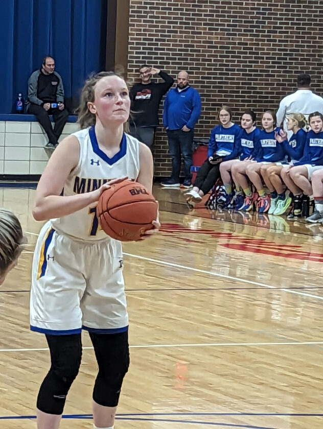 Photo by Chris Drummond Minneota Vikings guard Dakoda Hennen (14) shooting a free throw late in the second half in Thursday evening game against the Tracy-Milroy-Balaton Panthers.