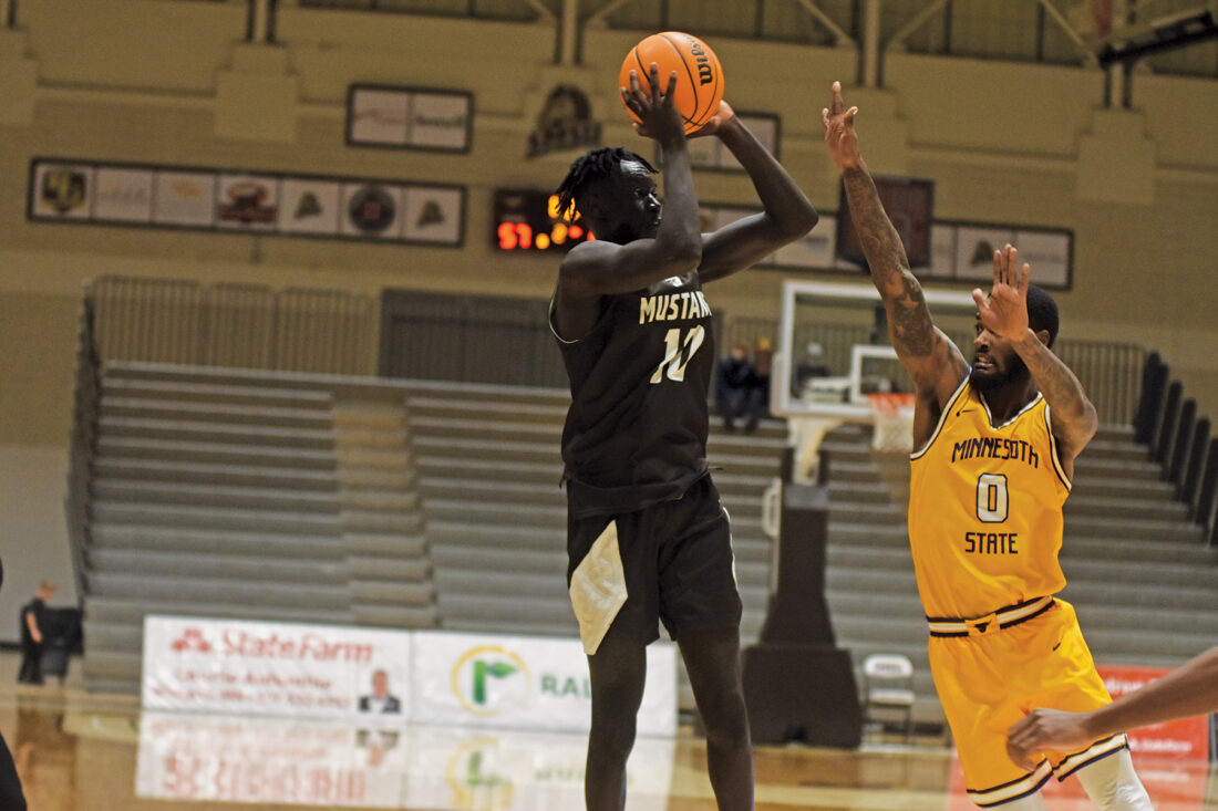 Photo by Jake McNeill Dunwa Omot (10) shoots a 3-pointer over a Minnesota State defender in the Mustangs’ 62-58 win over No. 14 Minnesota State in Marshall on Saturday afternoon.