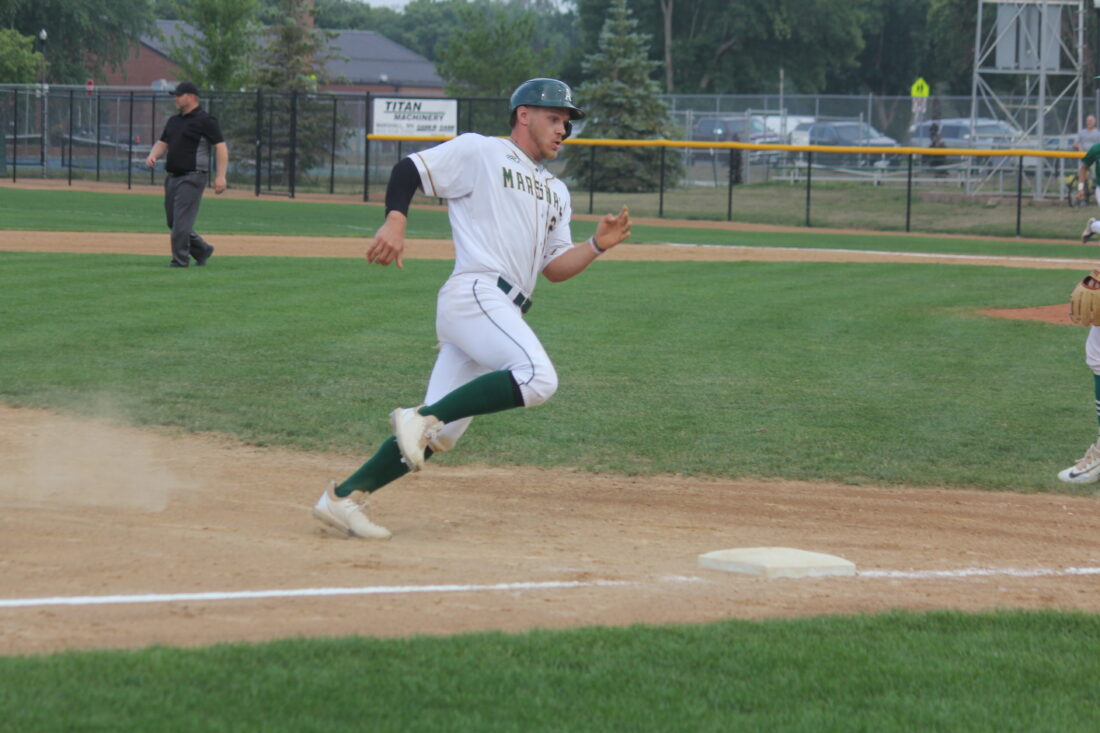 Photo by Jake McNeill: Marshall designated hitter Hunter Wienhoff rounds third base in the seventh inning of the A's 5-2 loss to Bird Island in their final home game of the season on Sunday afternoon.