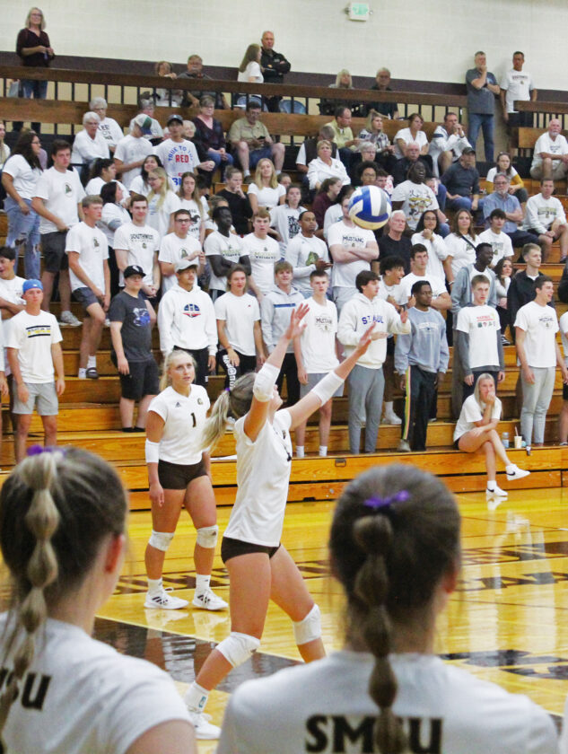 Independent file photo Southwest Minnesota State University setter Alisa Bengen throws up a serve in the first set of SMSU’s annual “White Out” game against Winona State University on Sept. 9, 2022.