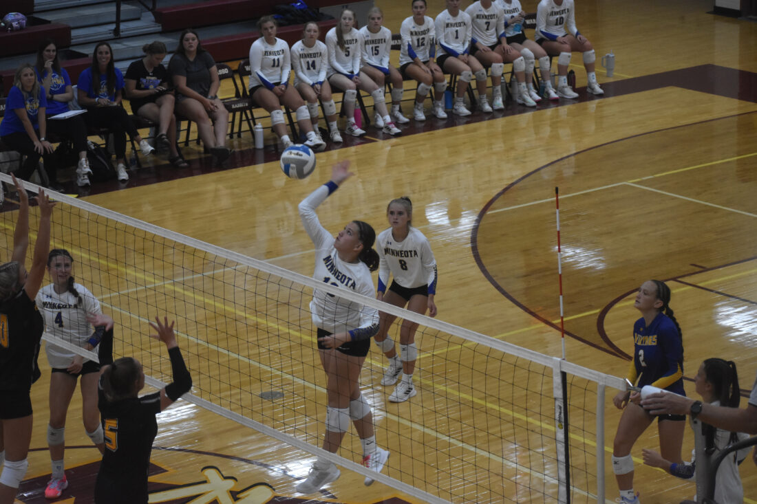 WABASSO — Class A’s top-ranked Minneota volleyball team started its season with a bang on Tuesday night, taking a straight-sets road win against No. 9 Wabasso. Each of the three sets ended with a 25-15 score in favor of the Vikings.