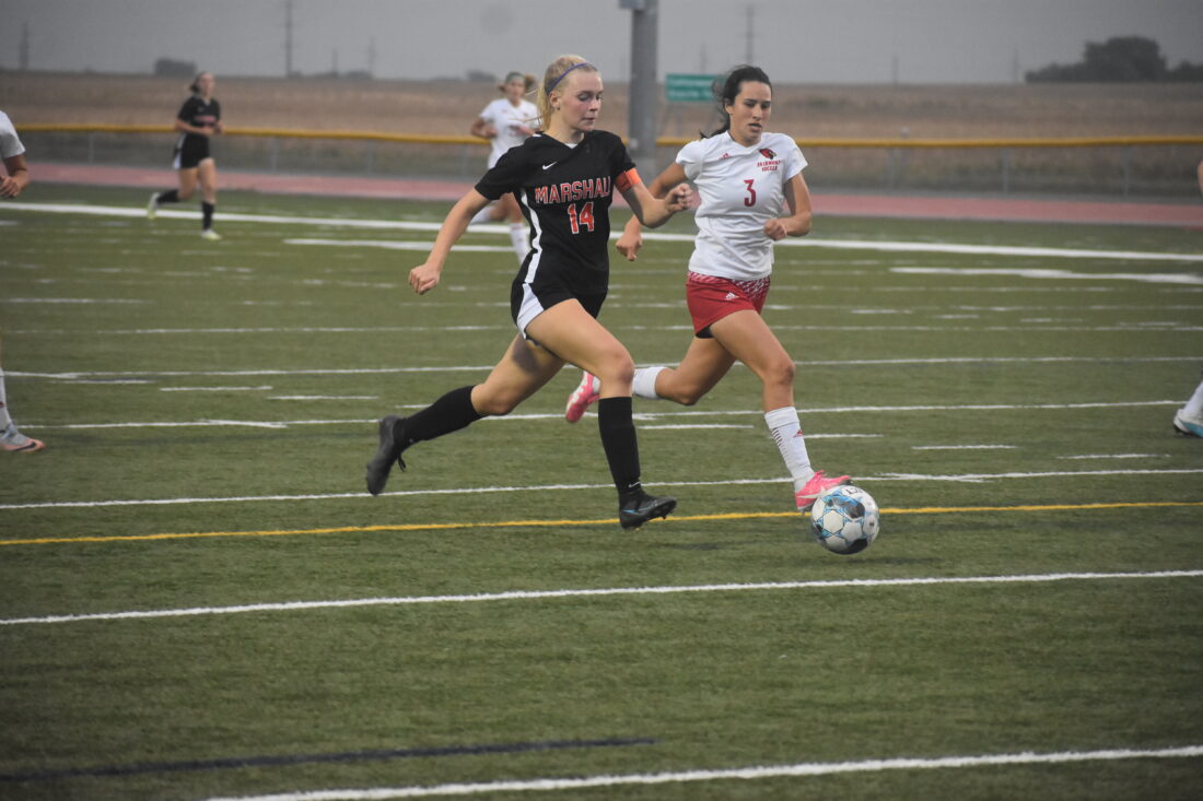 The Tigers scored early and often in the first half, taking a 2-0 lead into the break. Elsie Deutz scored by grabbing a loose ball in the box, beating the Fairmont defenders, and sending a shot into the bottom left of the net for a 2-0 Marshall lead.