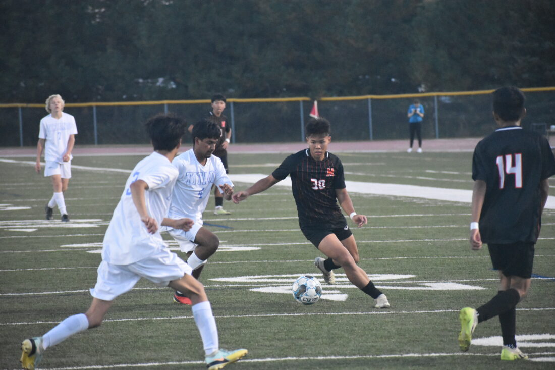 Photo by Jake McNeill: Marshall forward Moo Gay (30) weaves his way through the defense during a boys soccer game against Tri-City United in Marshall on Tuesday night. The Tigers defeated the Titans 8-1.