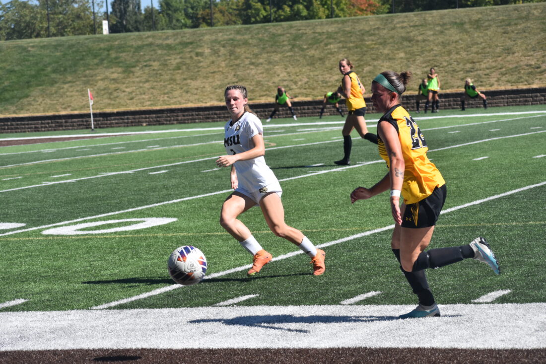 The SMSU drought ended when the Wildcats were called for a handball. Selena Prolic then stepped up to the spot and sent the penalty kick into the right side of the net for SMSU’s first home goal of the season and second goal overall, cutting Wayne State’s lead from three goals down to two.