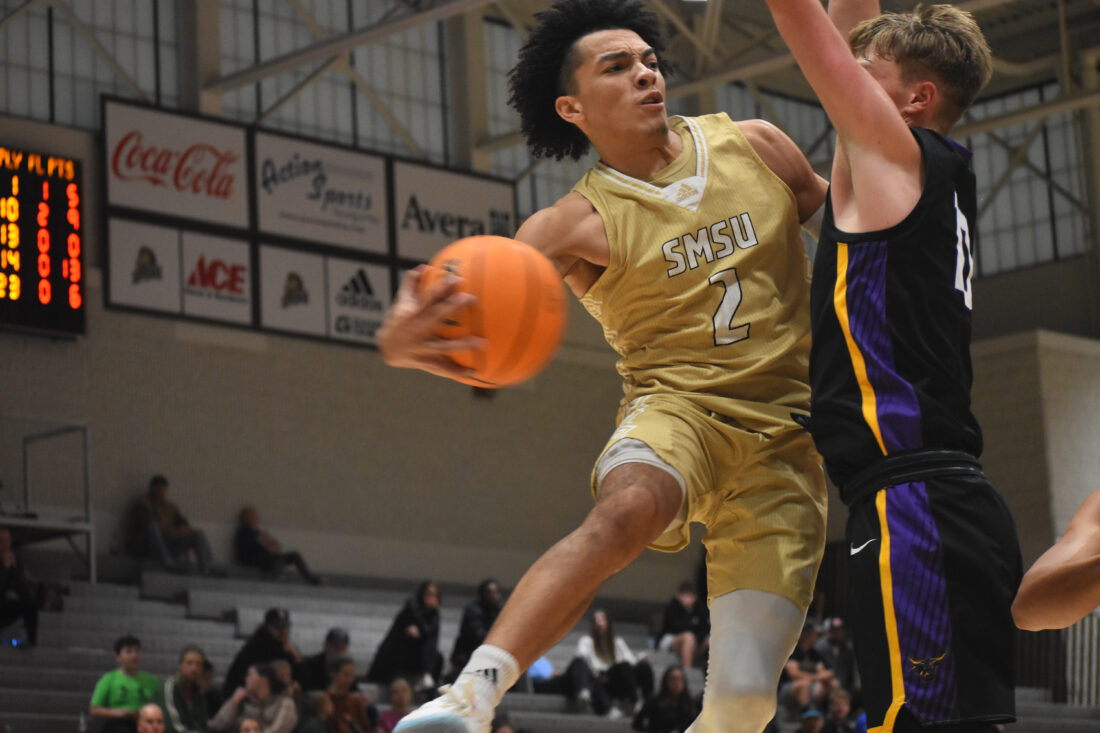 With seven minutes remaining in the first half, Braaten had a sequence in which he grabbed a rebound that led to a Mason Lund midrange jumper and then a steal leading to an Omot layup, extending SMSU’s lead to 34-17.