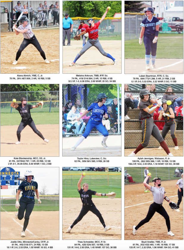 Danni Kockelman, Minneota/Canby, SS, Fr.; Aliyah Loftness, TMB, IF, Jr.; Aubreigh Rausch, Lakeview, LF, Sr.; Audrey Johnson, Wabasso, LF, Jr.; Paisley Thooft, RTR, 2B, So.