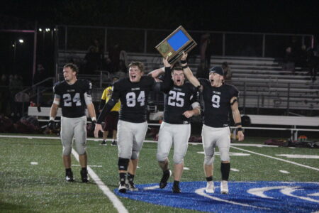 Photo by Samantha Davis: Red Rock Central's Carter Therkilsen (24), Austin Imker (84), Jake Erickson (25) and Abe Stavnes (9) receive the Section 2 Nine-Player championship after a 26-21 comeback victory over Wabasso Friday night, clinching a return to the state tournament. The Rabbits finish their season 8-2 overall.