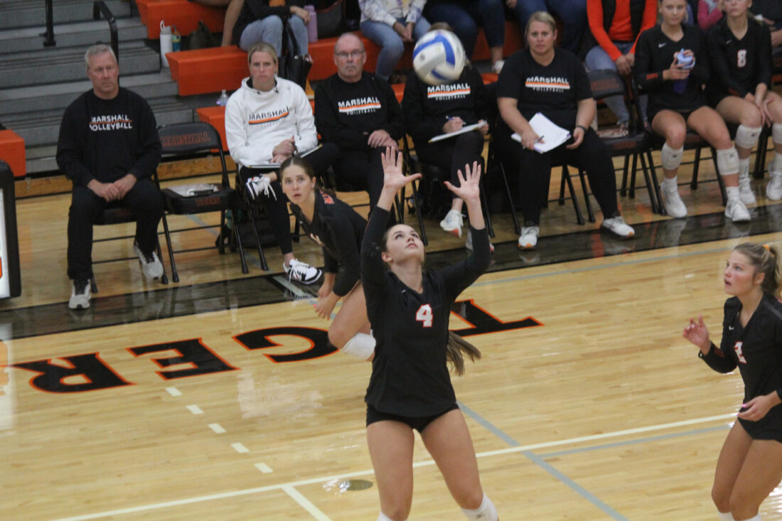 “After playing them [Alexandria] in last year’s state championship, it just felt nice to sweep them off the floor and kind of get our get-back,” Marshall setter Brooke Gillingham said, adding that she felt the team could have played much cleaner in the match but that it felt good to get the job done in three sets.