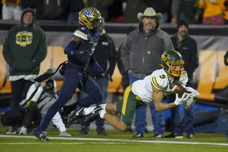 - North Dakota State wide receiver Bryce Lance, right, makes a catch in front of Montana State cornerback Simeon Woodard tpduring the second half of the FCS Championship NCAA college football game, Monday, Jan. 6, 2025, in Frisco, Texas. North Dakota State won 35-32. (AP Photo/Julio Cortez)