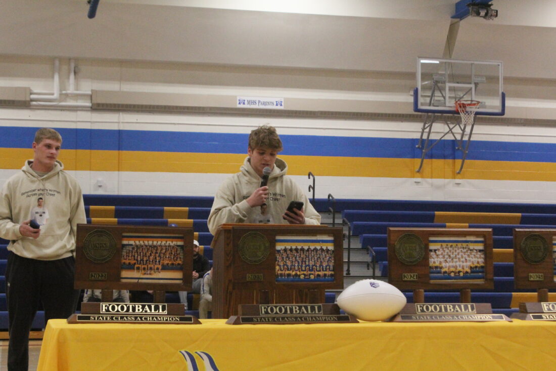 “I want to thank the past three teams that made this accomplishment [possible],” senior Adam DeVlaeminck said, who was unable to attend the ceremony but spoke over the phone. “It’s pretty special for me, and I know for the school and the community to be able to accomplish this goal … I’m just super excited to be a part of this team, and super excited to be a Minneota Viking. Once a Viking, always a Viking.”