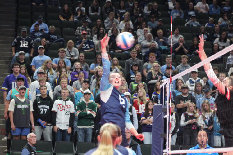 Photos by Samantha Davis: Russell-Tyler-Ruthton's Sara Thooft (left), Brezlyn Buchert (middle) and Ava Karbo (right) smile with one another going into the third set in the Class A state semifinals Friday night at Grand Casino Arena in St. Paul. The Knights defeated Ada-Borup-West 3-1, and advance to Saturday's state championship. Below: RTR's Sara Thooft goes up for a hit in the fourth set. Below: RTR's Dru Ellefson sets up a pass. Below: RTR's Laken Baartman goes in for a dig in the first set. Below: The RTR volleyball team celebrates after winning a point in the third set.