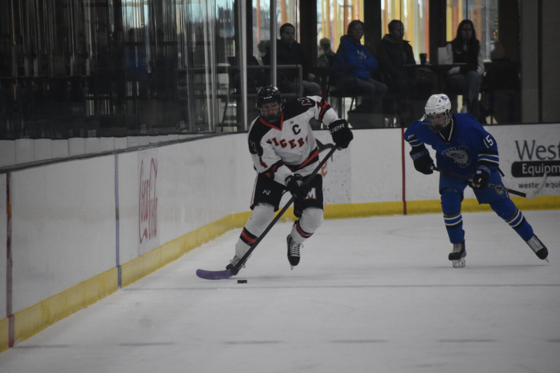MARSHALL –Entering the final period tied up with pressure building up, the Marshall boys hockey team came up short in a 3-1 section and Big South Conference loss to Minnesota River Saturday afternoon, after the Bulldogs scored twice in the third period. Junior forward Jacob Allen scored the Tigers’ goal in the second period that initially tied the game up.
