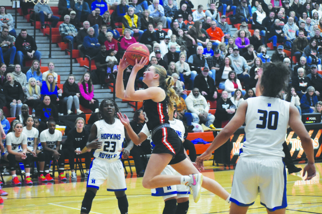 MARSHALL — A tightly contested first half wasn’t enough for the No. 3AAA Tigers to upset Class 4A’s top-ranked Hopkins on Thursday night. The Tigers led until the final seconds of the half, but the Royals tied the game up at the buzzer and started the second half hot to pull away and hand Marshall an 80-57 loss.
