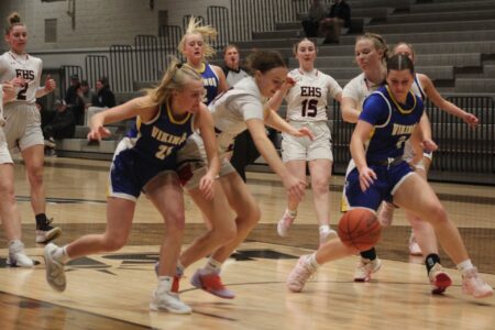 Photo by Samantha Davis: Minneota's Ava Rost (left) and Eden Meagher (right) both reach to grab a steal in the first half against Edgerton Tuesday night in a non-conference prep basketball game at Southwest Minnesota State University. The Vikings defeated the Flying Dutchmen 72-41.