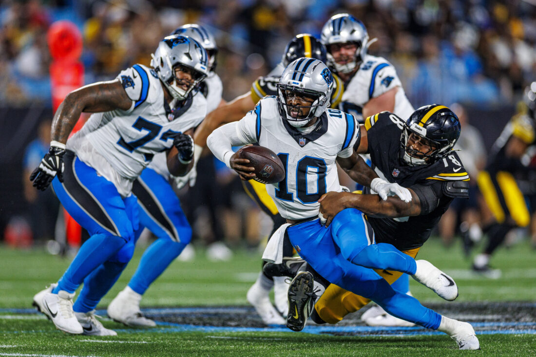 Carolina Panthers quarterback Bryce Perkins (10) is sacked by Pittsburgh Steelers defensive end Yahya Black (78) during an NFL football game on Thursday, Aug. 21, 2025, in Charlotte, N.C. (AP Photo/Rusty Jones)