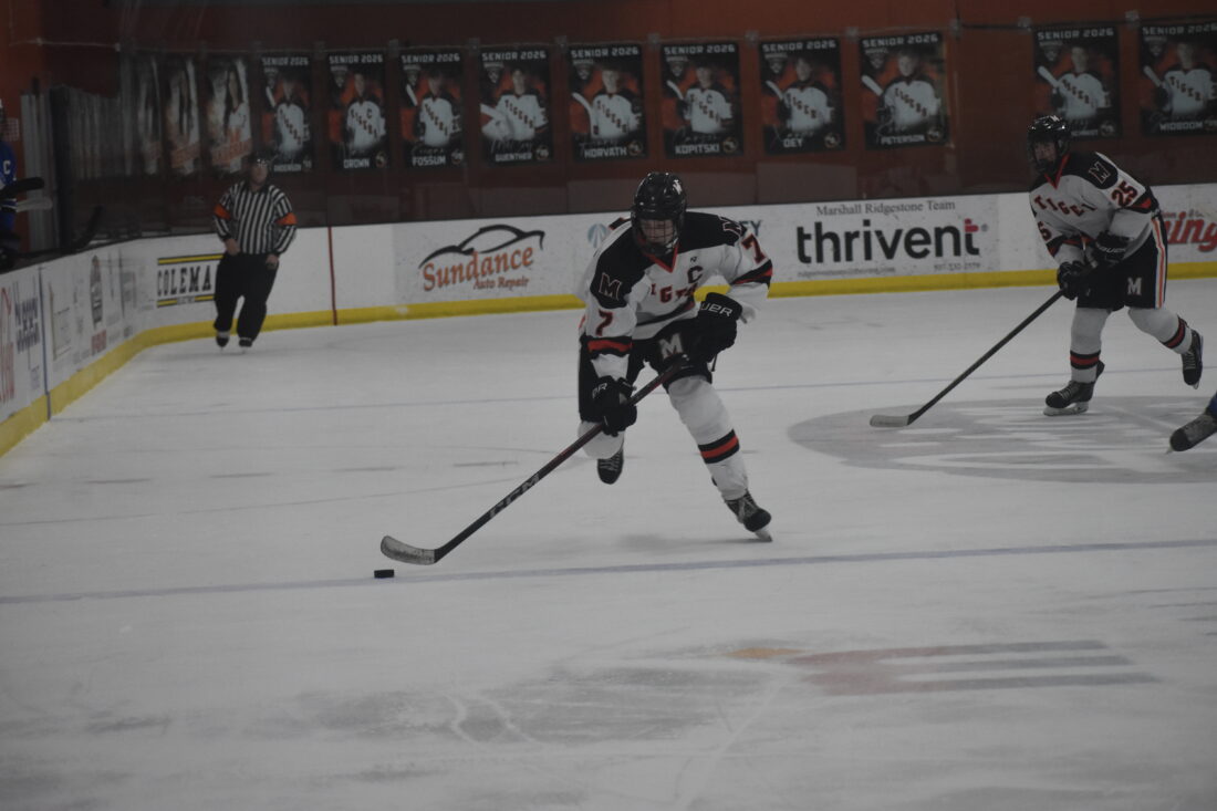 Photo by Samantha Davis: Marshall's Jacob Allen brings the puck up the ice on Dec. 22, 2025, against Windom in Marshall.