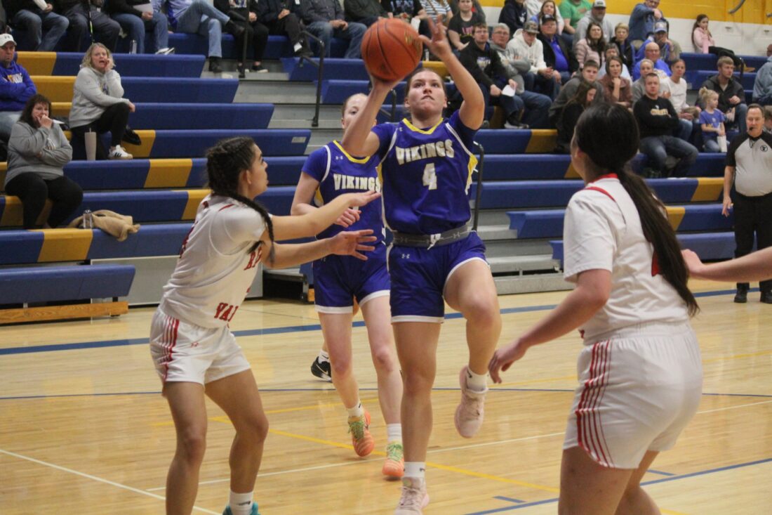 - Photos by Samantha Davis: Minneota’s Eden Meagher goes up for layup in the first half against Redwood Valley Friday night in a non-conference prep girls basketball game at Minneota High School. The Vikings defeated the Cardinals 63-30.