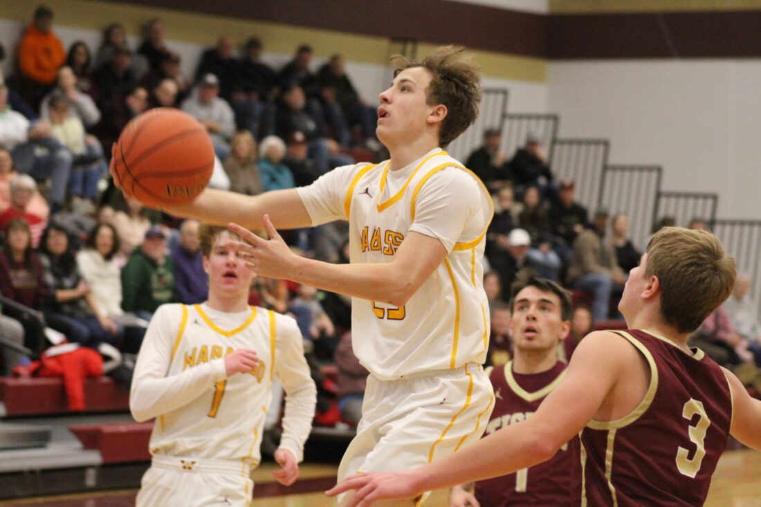 Photo by Travis Rosenau: Wabasso’s Brooks Baune scores on a layup during the first half of Tuesday night’s Tomahawk Division boys basketball game at Springfield High School.