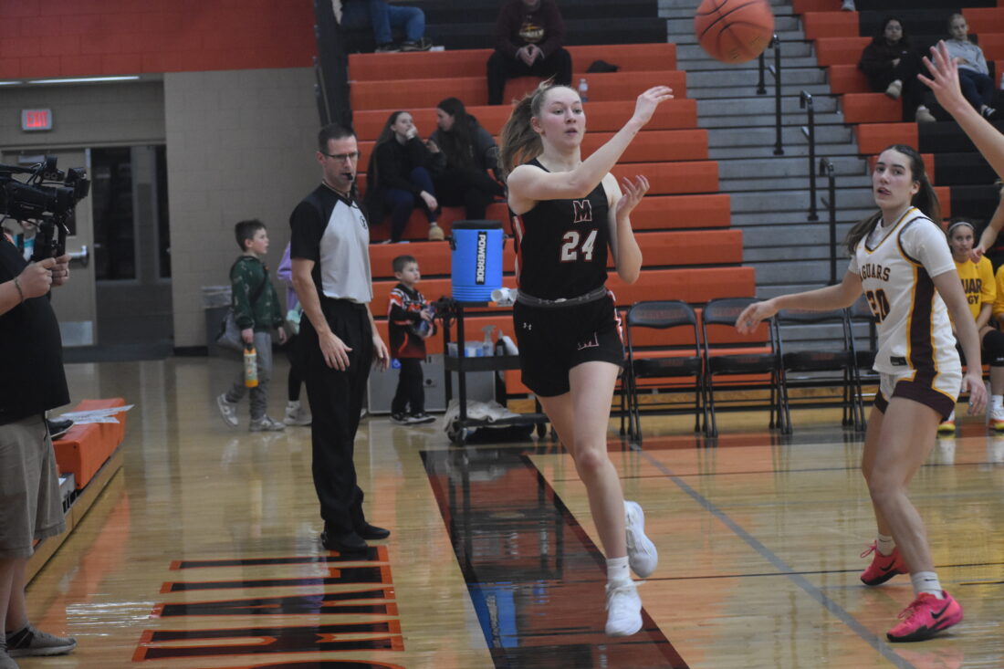 Photo by Jake McNeill: Marshall forward Avery Schneekloth saves a pass from going out of bounds during the first half of a Big South Conference girls basketball game against Jordan on Tuesday in Marshall.