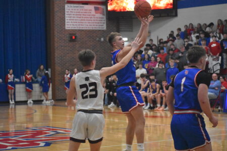 - Photo by Jake McNeill: Tracy-Milroy-Balaton forward Aiden Sanow shoots a midrange jumper during a Camden Conference boys basketball game against Yellow Medicine East, Tuesday in Tracy.