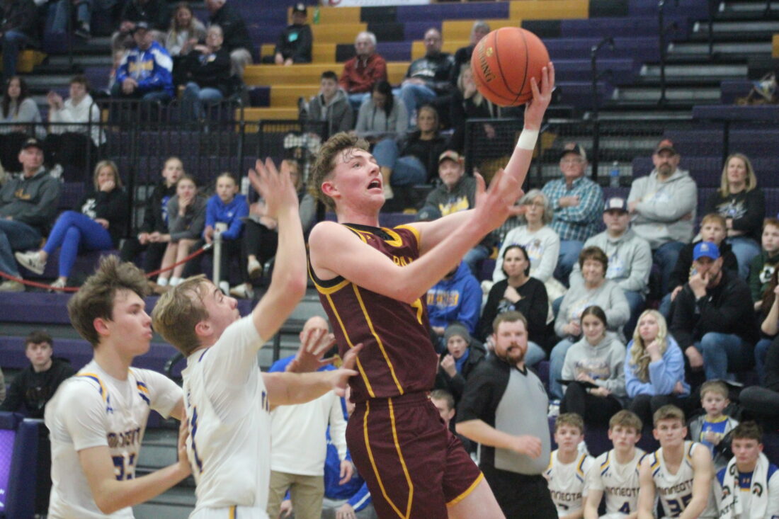 - Photo by Samantha Davis: Wabasso’s Tavyn Larson goes up for a basket against Minneota on Saturday in the Section 3A North subsection quarterfinals at Montevideo High School. The Rabbits defeated the Vikings 81-60.