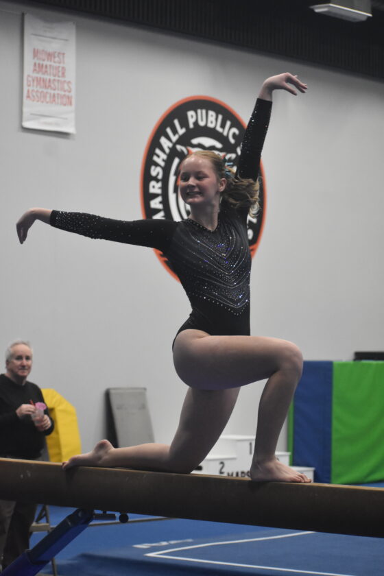 The Marshall gymnastics team fielded a younger roster this year. Aside from Goergen and sophomores Kiera Clemens and Avery Schauman, the team was made up of four eighth graders and six seventh graders.