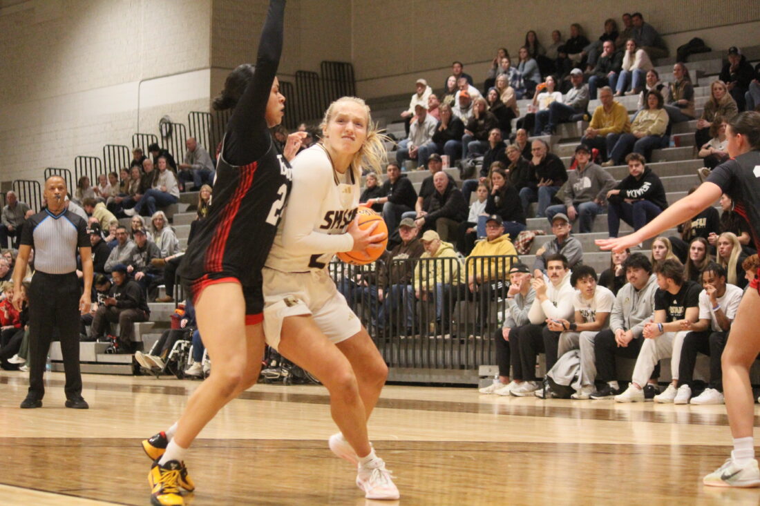 Photo by Samantha Davis: Southwest Minnesota State University senior Audrey Swanson drives the lane against Minot State on Jan. 16 at the R/A Facility in Marshall. The Mustangs will host Augustana today for senior night before traveling to Wayne State on Saturday to close the regular season.