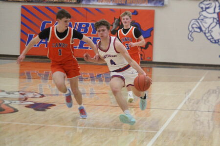 - Photos by Samantha Davis: Tracy-Milroy-Balaton’s Connor Lanoue (right) brings the ball up the court in the first half against Canby Friday night in a Camden Conference prep boys basketball game. Lanoue led the Panthers with 20 points in a 73-55 win.