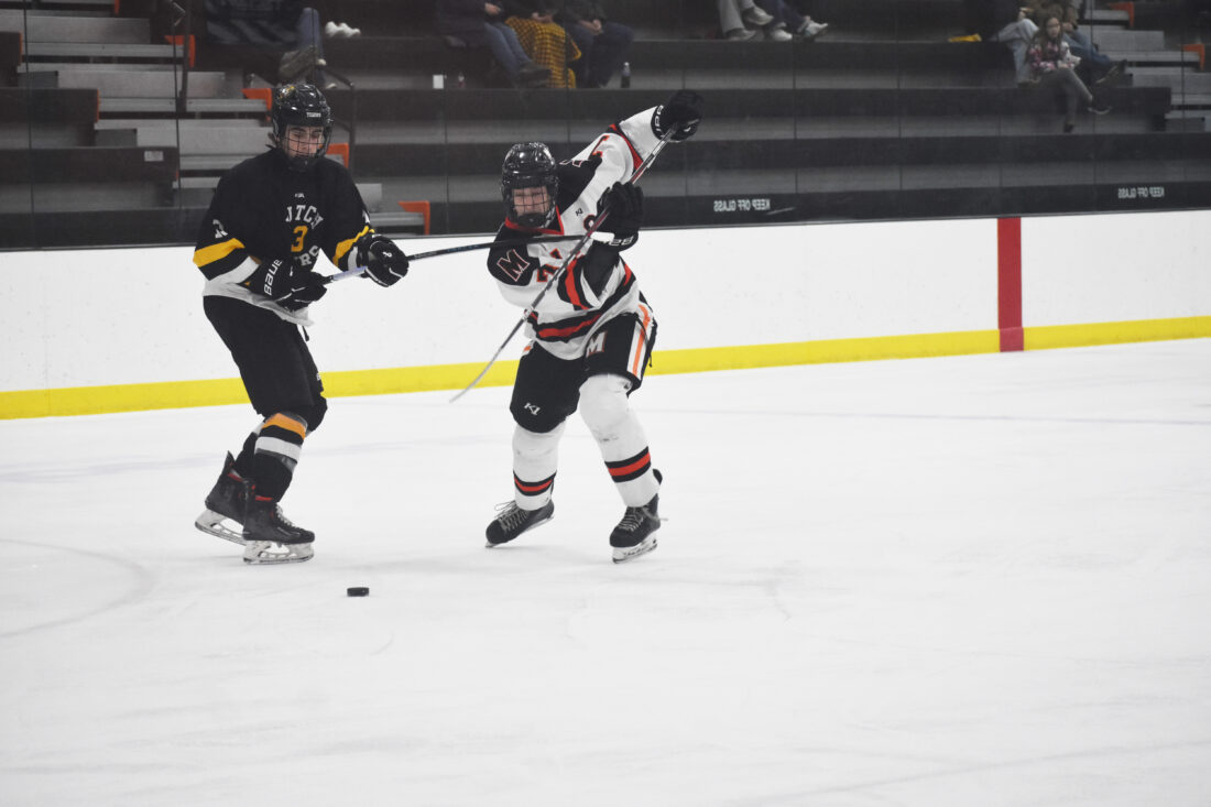 Jacob Allen gave Marshall some early momentum by scoring the game’s first goal. After coming up with a takeaway near the blue line, Allen just had one defender to beat between himself and the goalie. He deked his way past the defender and beat the goalie to the right post to give Marshall a 1-0 lead eight minutes into the game.