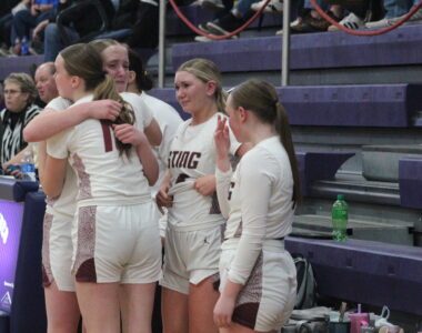 Photos by Samantha Davis: Yellow Medicine East seniors Alana Almich (back of hug) and Bayli Sneller (middle) hug their teammates one by one after subbing out for the final time in their prep basketball careers Saturday afternoon at Montevideo in the Section 3A North subsection quarterfinals. The Sting fell to the Wolverines 82-52, and finish their season 9-18 overall.