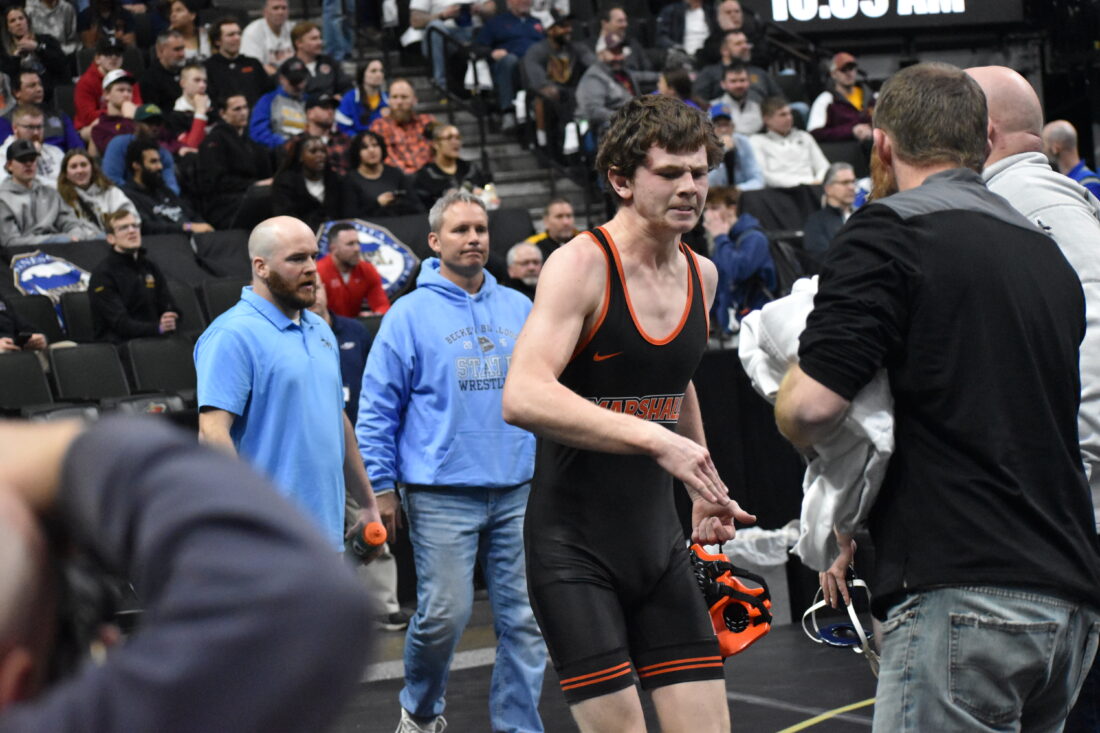 Photo by Ari Selvey: Marshall's Brayden Chandler walks over to his coaches after earning a 160-pound Class AA state quarterfinal win, Friday at Grand Casino Arena in St. Paul.