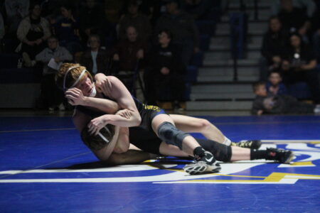 - Photos by Samantha Davis: Minneota’s Blake Mead (top) wrestles with BOLD’s Trevor Plass in the 133 match Thursday night in the Section 5A quarterfinals. The Vikings defeated the Warriors 63-6 and advance to the section semifinals.
