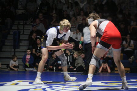 - Minneota’s Mason Javers (right) takes on BOLD’s Trey Zamarron in the 160 match Thursday night.