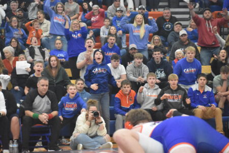 - Photo by Jake McNeill: The Canby fan section reacts as Canby’s Jordan DePestel pins his opponent in the 285-point Section 5A championship, Saturday in Canby.