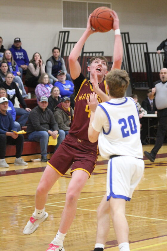 Photo by Travis Rosenau: Wabasso's Brayden Guetter goes up with a shot during the Tomahawk/Valley Conference Championship game against Nicollet, Tuesday in Wabasso.