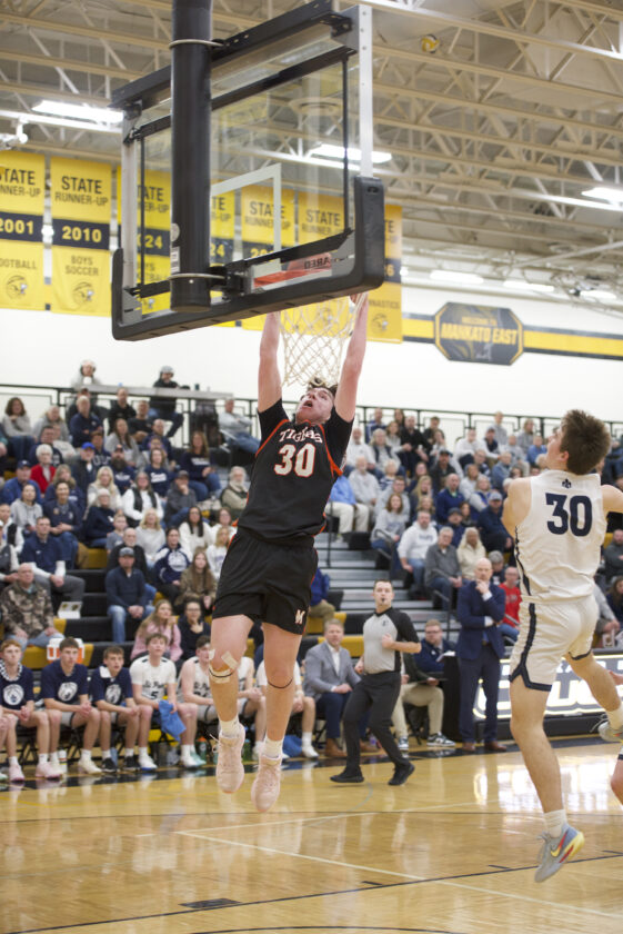 ST. PETER – A pair of strong scoring performances from Patrick Morman and Oliver Voigt weren’t able to extend the second-seeded Marshall boys basketball team’s season on Saturday night at Gustavus Adolphus College. Taking on No. 3 St. Peter in the Section 2AAA semifinals, the Tigers led 29-27 at halftime but ran out of steam in the second half, falling 64-54.