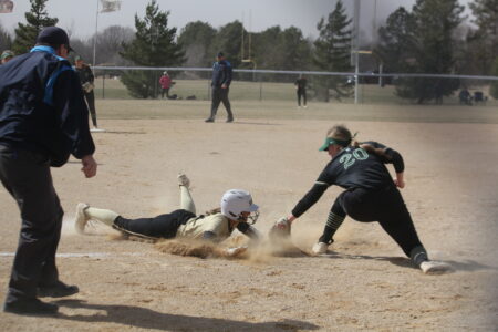 - Photo by Samantha Davis: Southwest Minnesota State University’s Morgan Alar safely steals third base in the second game of a doubleheader against Bemidji State Saturday afternoon at Mustang Field.