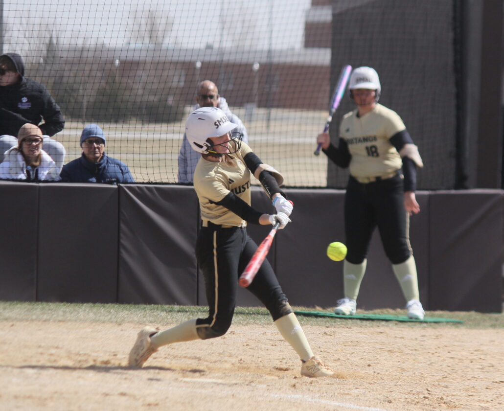 - Photo by Samantha Davis: Southwest Minnesota State University’s Emma Humpal connects for a hit in the first game of a doubleheader against Bemidji State Saturday afternoon at Mustang Field.