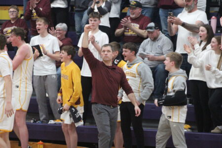 Photo by Samantha Davis: Wabasso head coach Scott Leopold pumps his fist in celebration in the final seconds of the Section 3A North subsection semifinals Tuesday night after the Rabbits defeated Dawson-Boyd 89-70 and advanced to the subsection championship.