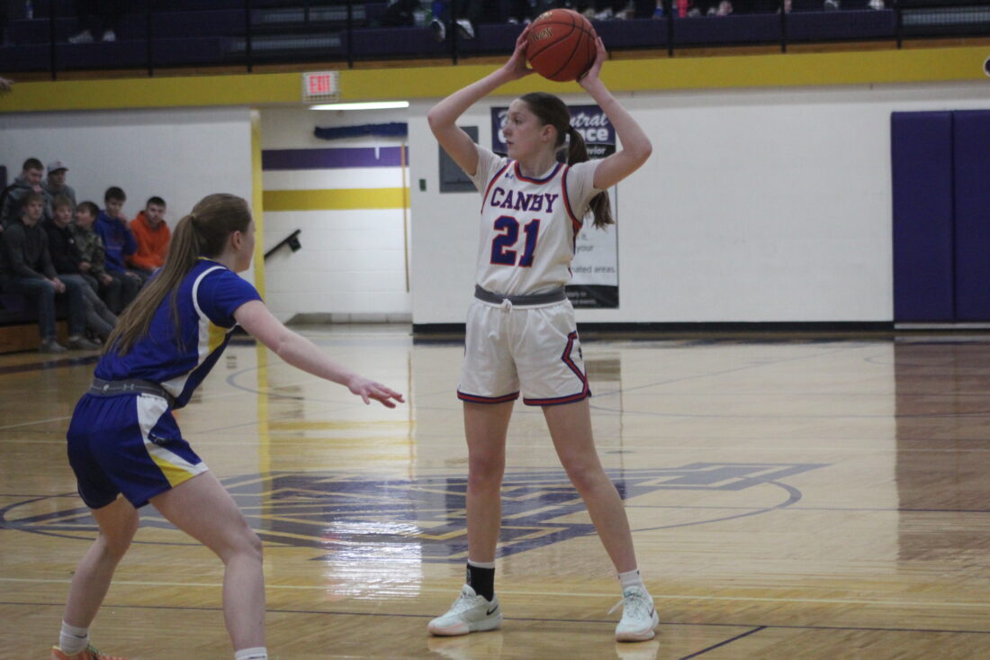 - Photo by Samantha Davis: Canby junior Ava Danielson looks around on offense against Minneota at Montevideo High School in the Section 3A North subsection quarterfinals on Feb. 21.