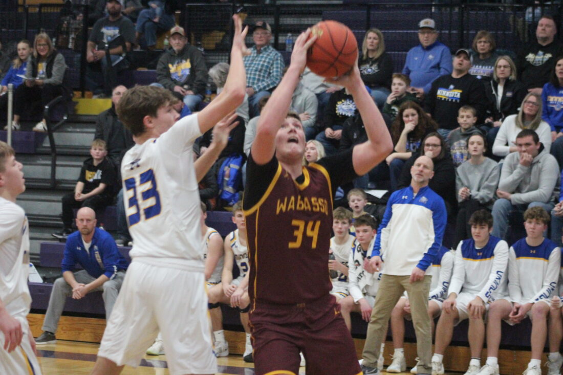 Photo by Samantha Davis: Wabasso's Caden Frericks (34) goes up with a shot during the 3A North subsection quarterfinals against Minneota, Saturday in Montevideo.