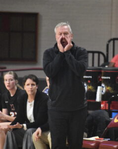 Photo by Samantha Davis: Marshall girls basketball head coach Dan Westby calls out a play from the sidelines in the Class 3A state quarterfinals against Totino-Grace on March 11 at Maturi Pavilion in Minneapolis.