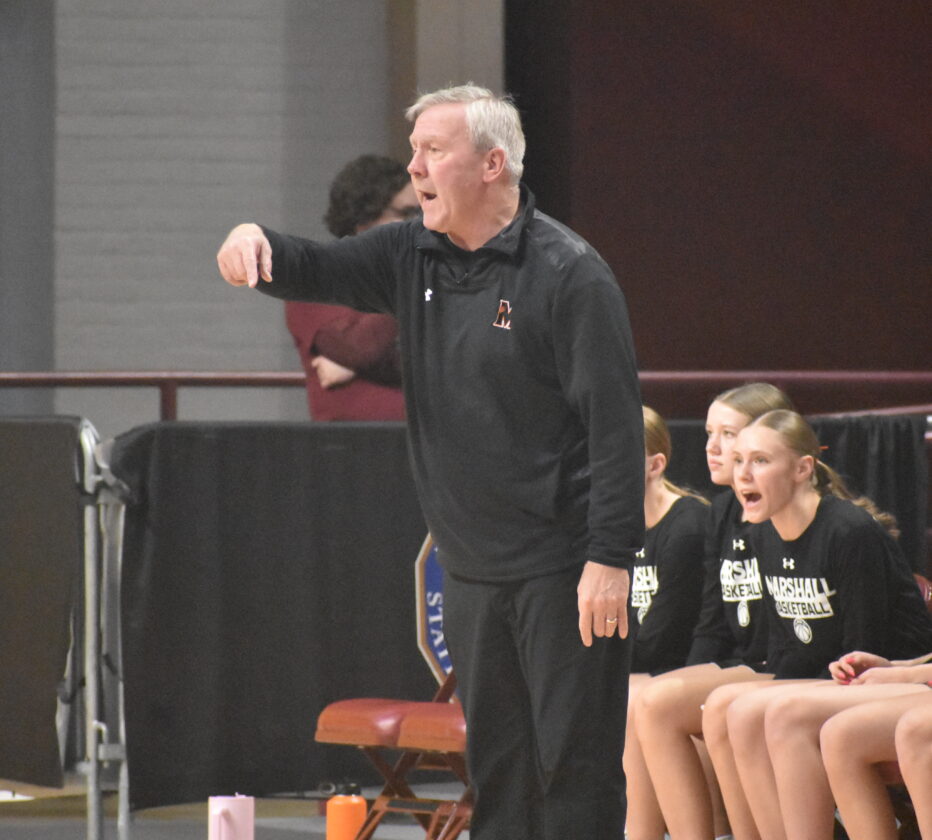 - Photo by Samantha Davis: Marshall girls basketball head coach Dan Westby calls out a play from the sidelines in the Class 3A state quarterfinals against Totino-Grace on March 11 at Maturi Pavilion in Minneapolis.