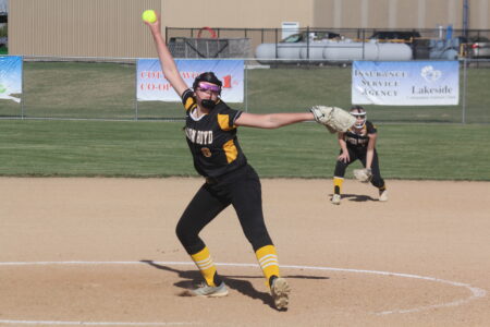 - Photo by Samantha Davis: Lakeview’s Makenna Anderson throws a pitch Thursday night against Dawson-Boyd in a Camden Conference matchup in Cottonwood.