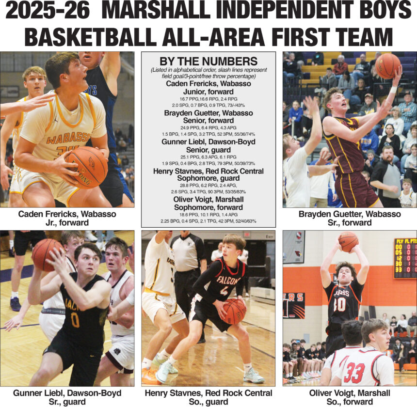 MARSHALL — The Wabasso and Dawson-Boyd boys basketball teams each earned three selections to the Independent All-Area boys basketball team, announced on Wednesday. The Rabbits had their frontcourt duo of Caden Frericks and Brayden Guetter on the first team and guard Drew Kemp on the second team, while Dawson-Boyd had guard Gunner Liebl on the first team and forwards Jaxton Hastad and Landon Malecek on the second and third teams.