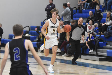 Photo by Jake McNeill: Dawson-Boyd forward Brayson Boike dribbles down the court during a boys basketball game against Lakeview in Cottonwood on Jan. 12. Boike is the area's all-time leading boys basketball scorer