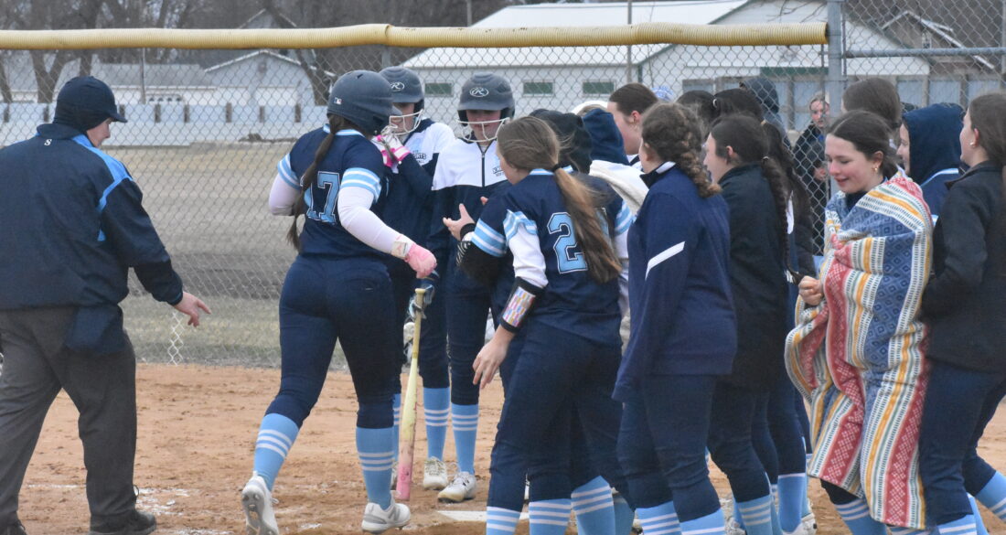 Photo by Jake McNeill: Russell-Tyler-Ruthton shortstop Laken Baartman (17) celebrates with her teammates at home plate after hitting a home run during a Red Rock Conference softball game against Adrian/Ellsworth, Thursday in Tyler.